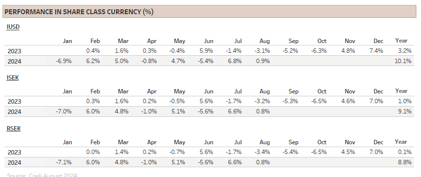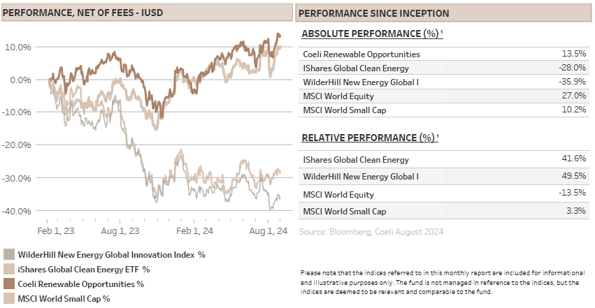 The Coeli Renewable Opportunities fund gained 0.9% net of fees and expenses in August (I USD share class). It is up 10.1% this year and has increased by 13.5% since the inception in February 2023.