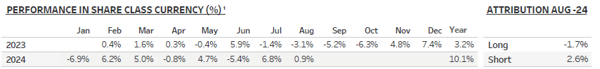 Triggered by recession fears, August started with a massive sell-off where the S&P 500 lost more than 6% in the first three trading days and the volatility index (VIX) spiked to levels only seen in the financial crisis and during Covid. Nevertheless, as overall economic activity numbers did not support the hard landing scenario, the VIX quickly receded while the S&P 500 recovered and ended the month up 2.3%, less than 0.5% below the all-time high in July.