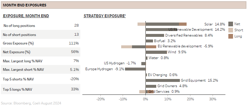 Performance was mixed without any standout winning or losing themes. The two pure short hydrogen themes led the winners as 8 out of 13 themes were up on the month. The ‘Solar’ theme also contributed positively due to the increased exposure to residential solar and despite the continued weak performance in utility scale solar. The largest losing theme was ‘Diversified Renewables’ which lost 1.4% of NAV after a weak Q2 report from Chart Industries (GTLS).