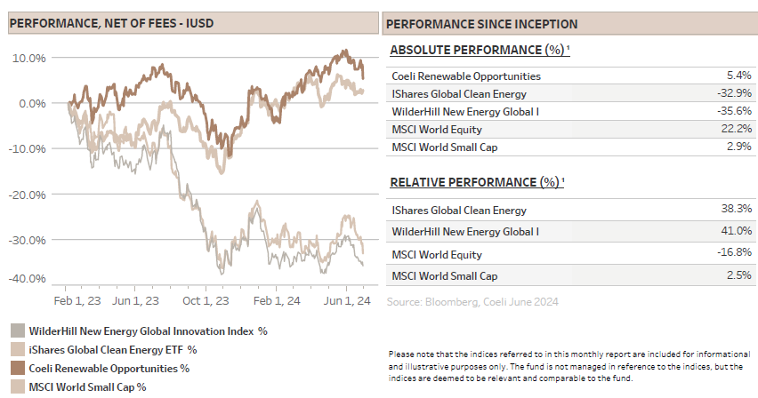 The Coeli Renewable Opportunities fund lost 5.4% net of fees and expenses in June (I USD share class). It is up 2.1% this year and has increased 5.4% since the inception on February 6, 2023.