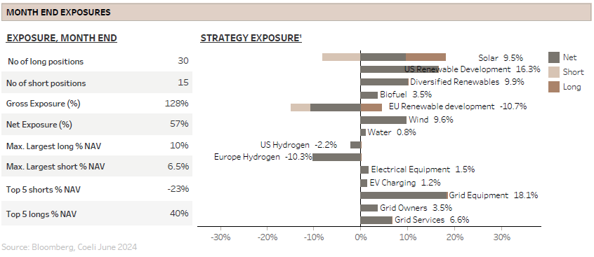 The worst performing theme of the month was “US Renewable Development” which deducted 2.8% from NAV. During June, Nextera Energy (NEE) and AES gave up 11% and 19%, respectively, underperforming the S&P 500 utility sub-sector which were down 6% and was the worst performing sub-index in the S&P 500. These large companies typically move in tandem with the broader clean tech industry, but both saw sharp declines following NEE’s investor conference. The company raised its capex expectations for 2027 but kept earnings projections in line with consensus. It seems like investors were taken aback by the need for increased investments to capitalize on the AI-driven data center boom and were disappointed that the earnings from these investments will take years to materialize. We believe it is likely that more companies riding the AI hype may face similar disappointments this year. Still, we continue to believe that NEE and AES will be relative winners among renewable energy developers and although we reduced the NEE position somewhat early in the month, we regard both stocks as core holdings.