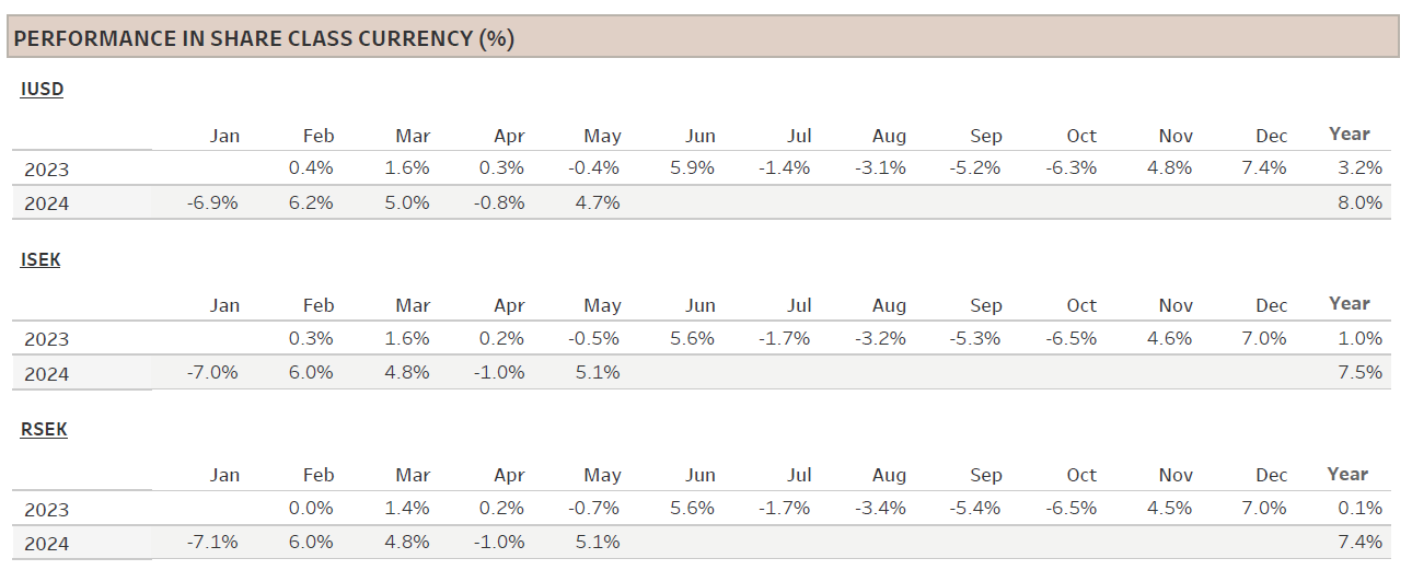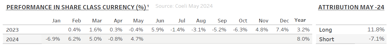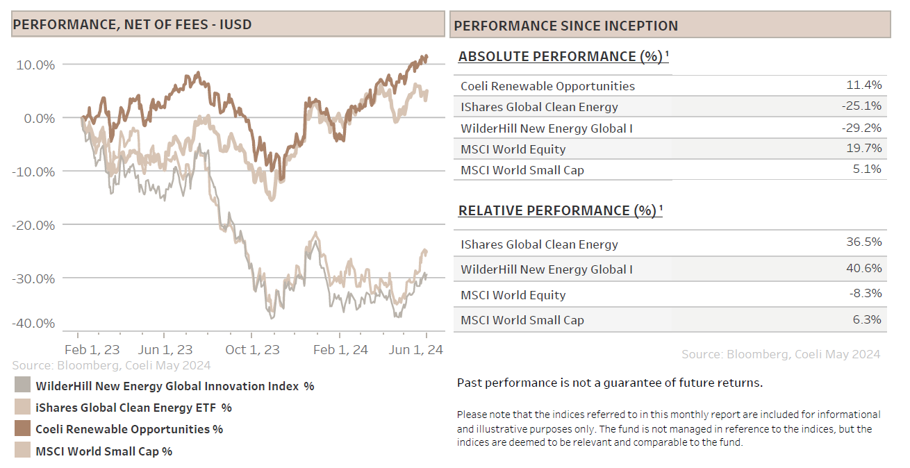 The Coeli Renewable Opportunities fund was up 4.7% net of fees and expenses in May (I USD share class). It has increased 8.0% this year and is up 11.4% since the inception on February 6, 2023.