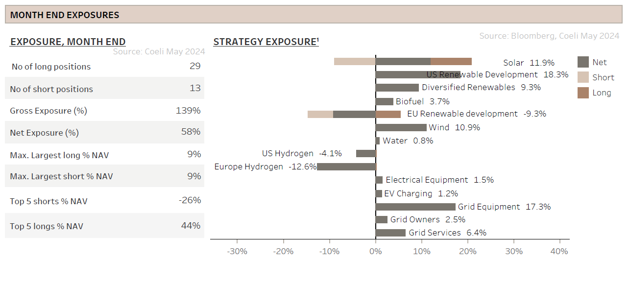 Net exposure was in the 50%-range for most of May and closed the month at 58%. The gross exposure was in the 130%-range most of the month and ended at 139%. The theme we previously called “Grid” is now split into four themes called “Grid Equipment”, “Grid Services”, “Grid Owners” and “Electrical equipment”. Although these stocks have had a great run year-to-date, we are still optimistic and looking to add to existing and new positions.