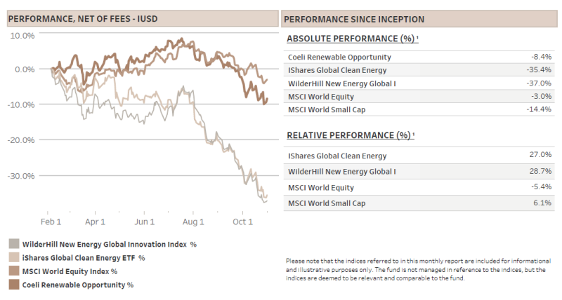 Even with October’s steep drawdown, the fund’s outperformance keeps growing. Relative to the two most comparable indices, the Wilderhill New Energy Global index (NEX) and the iShares Global Clean Energy (ICLN), the fund expanded its margin of outperformance by 7.3% and 4.8%, respectively. As these indices are down by about 30% over the last three months, booking their worst 3-month period for more than 10 years, the fund has successfully bolstered its cumulative outperformance since inception to 29% against the NEX and 27% versus the ICLN.