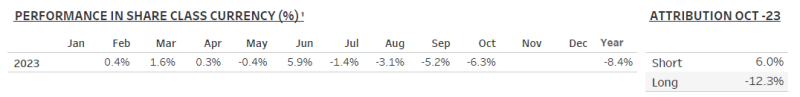 The only large winning theme in October was “European Hydrogen”, which contributed a 2% gain to the NAV. This success was not just a result of the wider sell-off in renewables; it was also driven by underwhelming order intakes for our shorted companies, which is impactful as they are all trading on EV/Sales multiples. We had tactically dialed back our net short position in the US Hydrogen theme as we increased our net exposure at the start of the month. In retrospect, this was clearly wrong.
