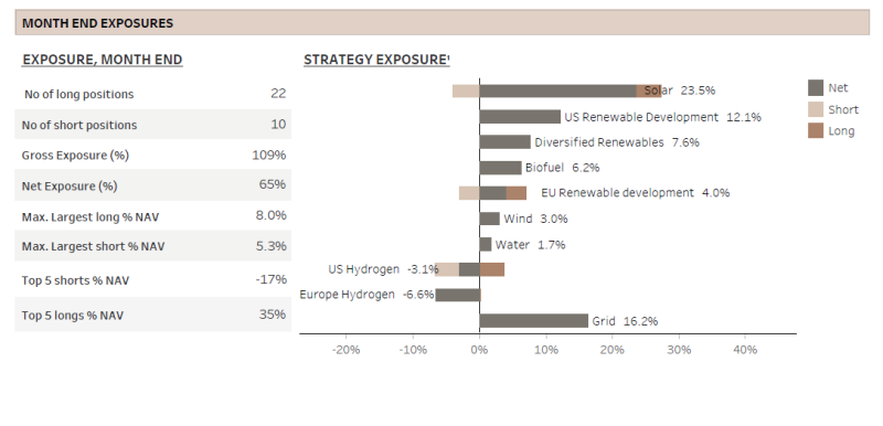 The fund lost 6.3% (I USD) in October as long positions lost 12.3% and shorts only made 6.0%. Half of the themes were positive or flat on the month, but the losing themes all incurred relatively large drawdowns. The net exposure was in the high 60% to low 70% for most of October, which clearly contributed to the loss as the key renewable indices fell between 11 and 14%. We ended the month with a net exposure of 65%, having pared down some positions in anticipation of early November earnings reports, but they were added back as soon as earnings-report-risk had passed. Gross exposure was in the 110-120% range most of the month.