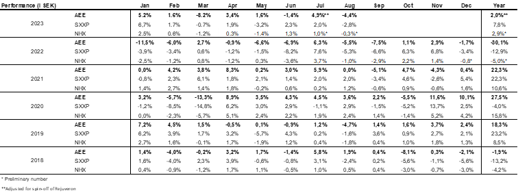 The fund’s value decreased by 4.4% in August (share class I SEK). The Stoxx600 (broad European index) decreased during the same period by 2.8% and HedgeNordic’s NHX Equities decreased provisionally by 0.3%. For 2023, the fund has decreased by 5.8%. Adjusted for the spin-off of Rejuveron, the fund’s value has increased by 2%. The Stoxx600 and NHX Equities have risen by 7.8% and 2.9% respectively during the year.